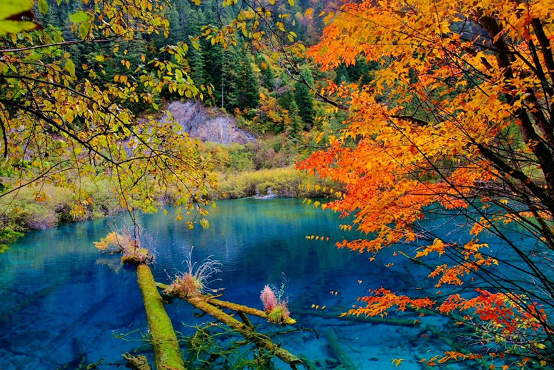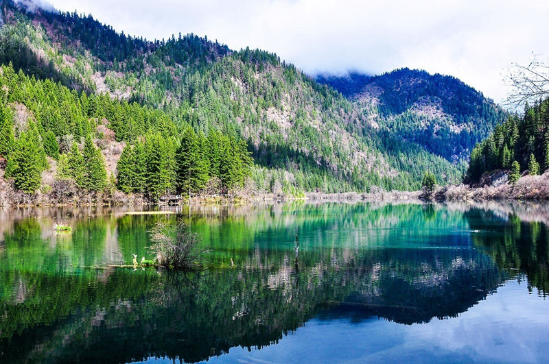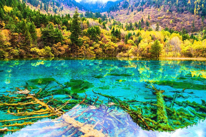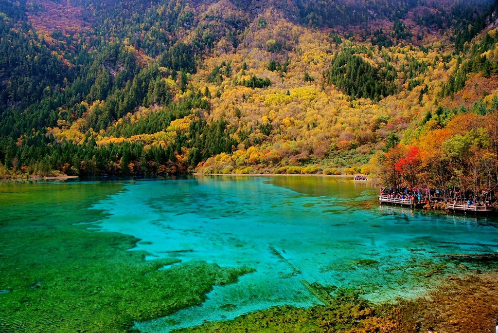 - Five Flower Lake (Wuhua Hai): Visit Five Flower Lake, one of the most iconic attractions in Jiuzhaigou Valley. Admire its stunning turquoise waters, surrounded by submerged ancient tree trunks and vibrant underwater vegetation.
